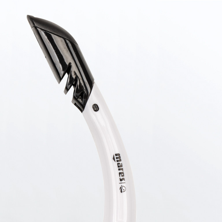 Il set X-One Marea è completato da un boccaglio in silicone ergonomico con top semiasciutto e tecnologia antis-splash. Presenta inoltre valvola di scarico per la pulizia dello snorkel.