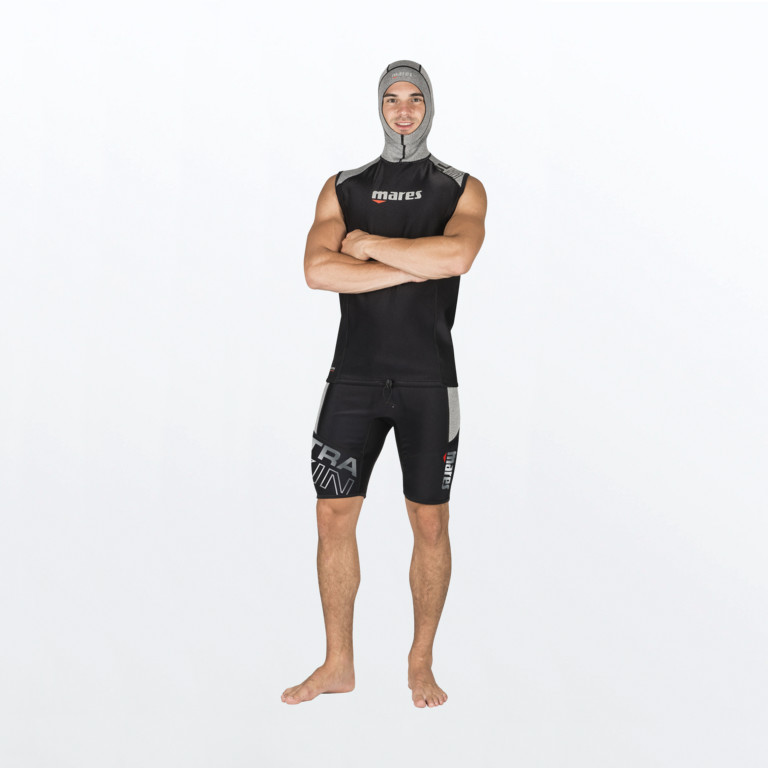 Sottomuta sub da uomo Ultraskin senza maniche e con cappuccio, realizzato con la tecnologia Ultraskin. La tecnologia Ultraskin combina 3 strati diversi: pile all’interno per il miglior comfort, membrana traspirante antivento e strato elastico all’esterno per vestibilità perfetta e libertà di movimento.