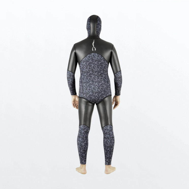 Il motivo poligonale nero è stampato su una base indaco, poiché è il colore meno riflettente, che assorbe i raggi UV, mascherando la forma del pescatore in apnea per un potenziale di pesca ottimale. Il nuovo design a tre materiali di tessuto elastico tra due strati di neoprene, rende questa una delle mute ad asciugatura più rapida sul mercato. Il materiale a pelle liscia utilizzato su petto, schiena e gambe consente un'asciugatura rapida ed è particolarmente utile durante le lunghe gite in barca di pesca subacquea.