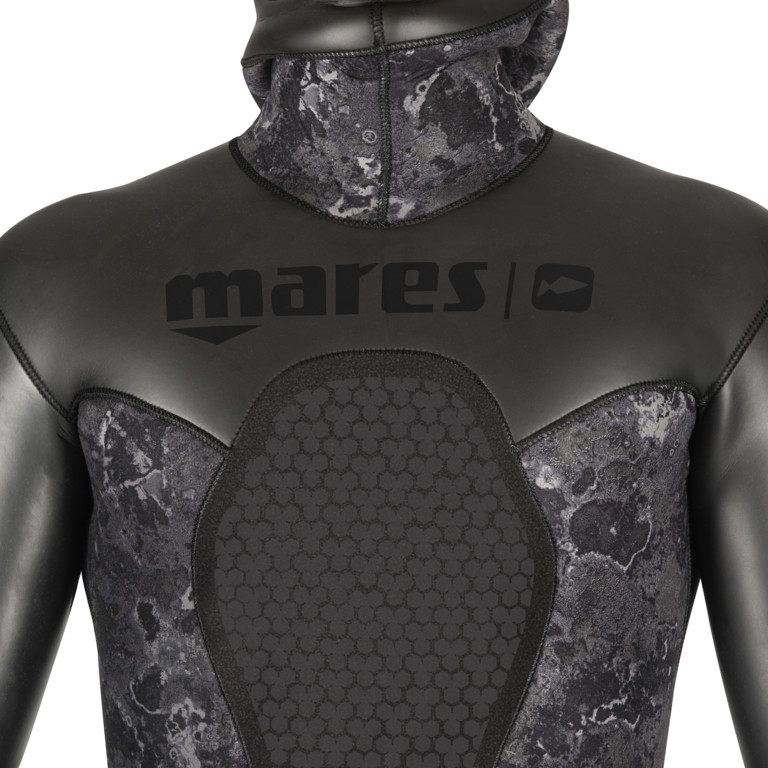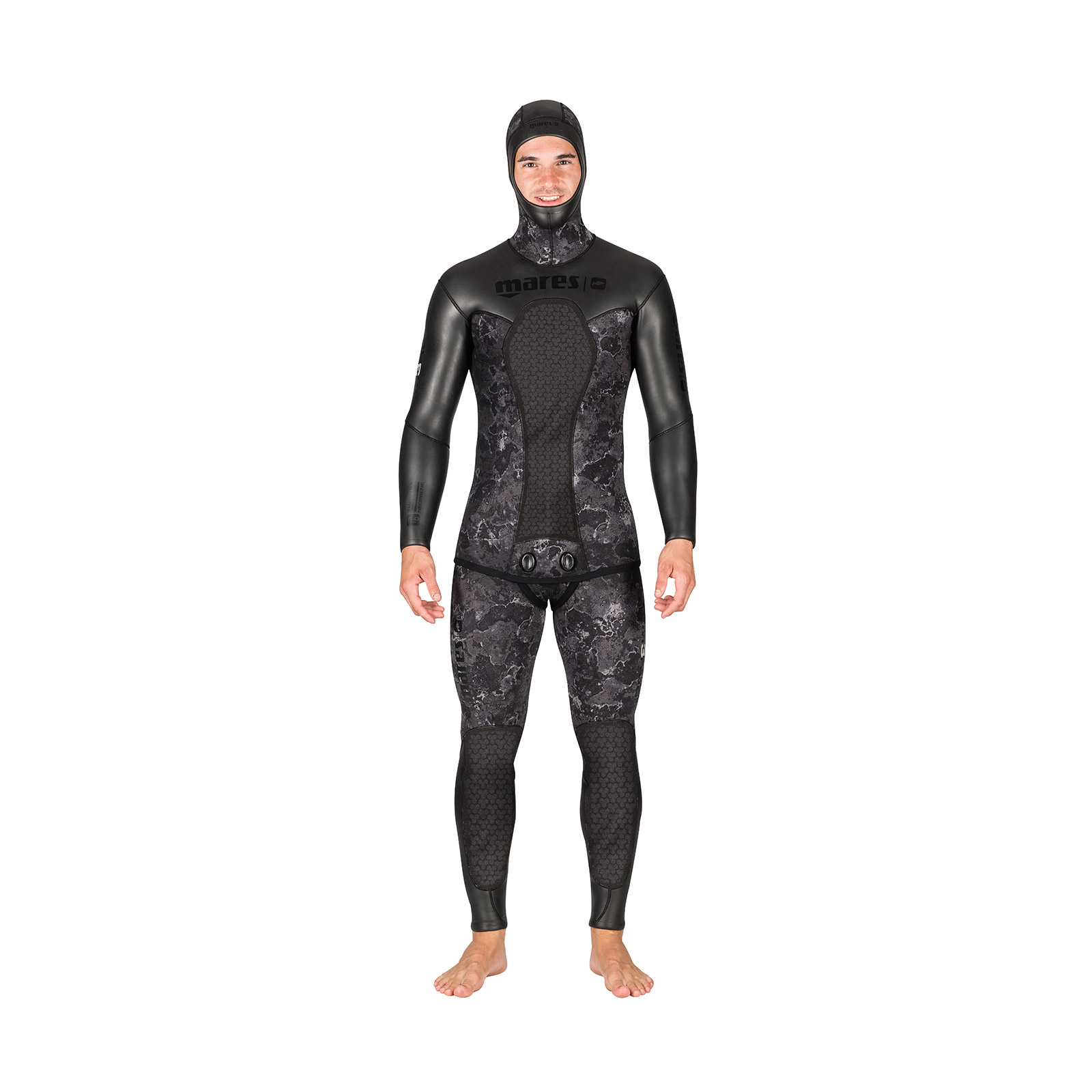 La muta mimetica nera di Mares M3erge è realizzata in un innovativo design a 3 materiali, in grado di offrire alta resistenza, elasticità, ed una vestibilità senza compromessi.
