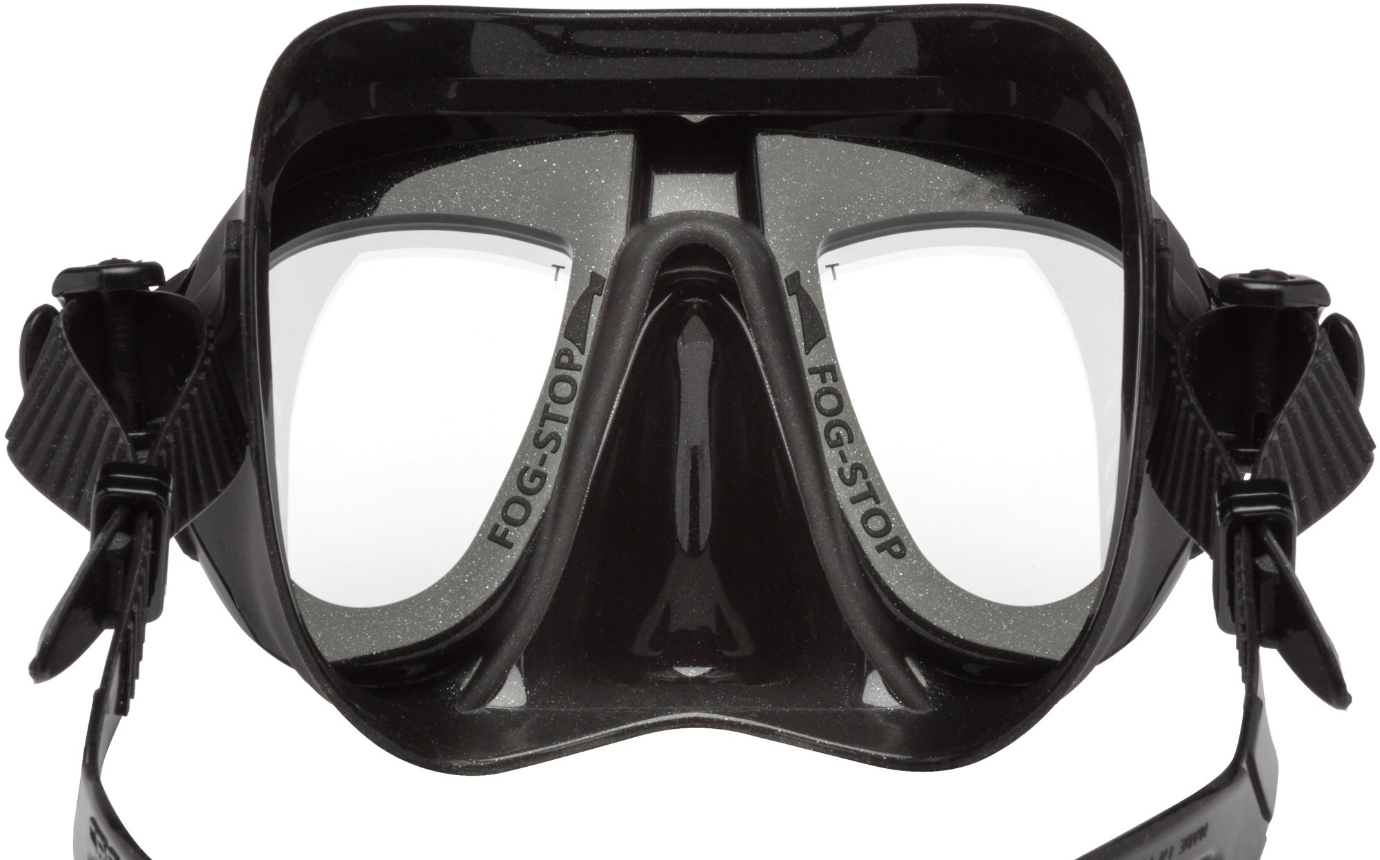 Una sottile membrana in silicone posta intorno al naso funge da deflettore in modo che l’aria calda proveniente dal naso quando si compensa la pressione esterna, non coinvogliata direttamente sulle lenti, riducendo la tendenza all’annebiamento che si trova comunemente nelle maschere di piccolo volume.
