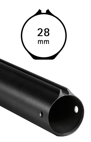 Fusto in anticorodal nero con guida asta integrato, impugnatura in tecnopolimero rinforzato con fibre di vetro, dotata di appoggio sternale morbido intercambiabile alto-basso.