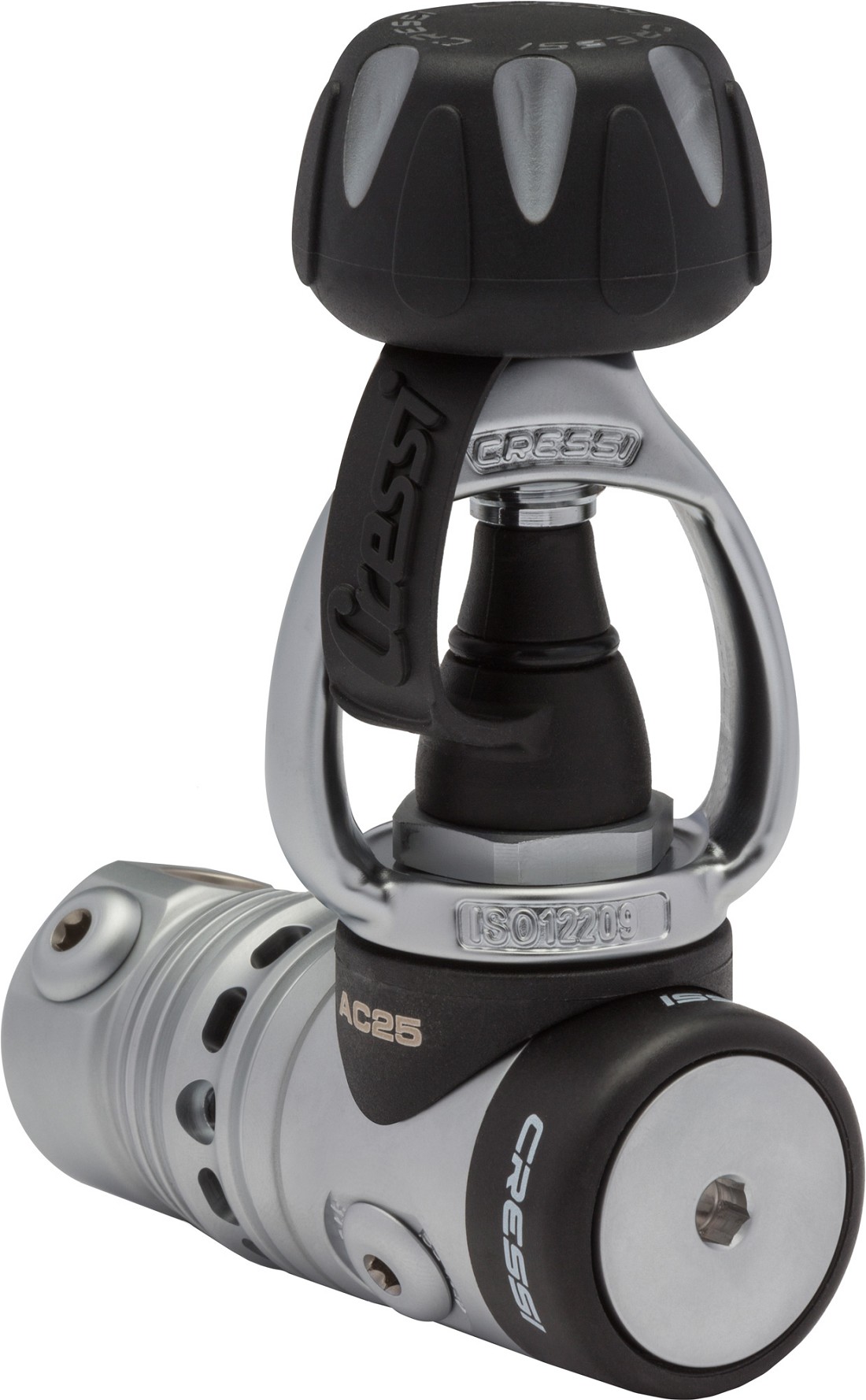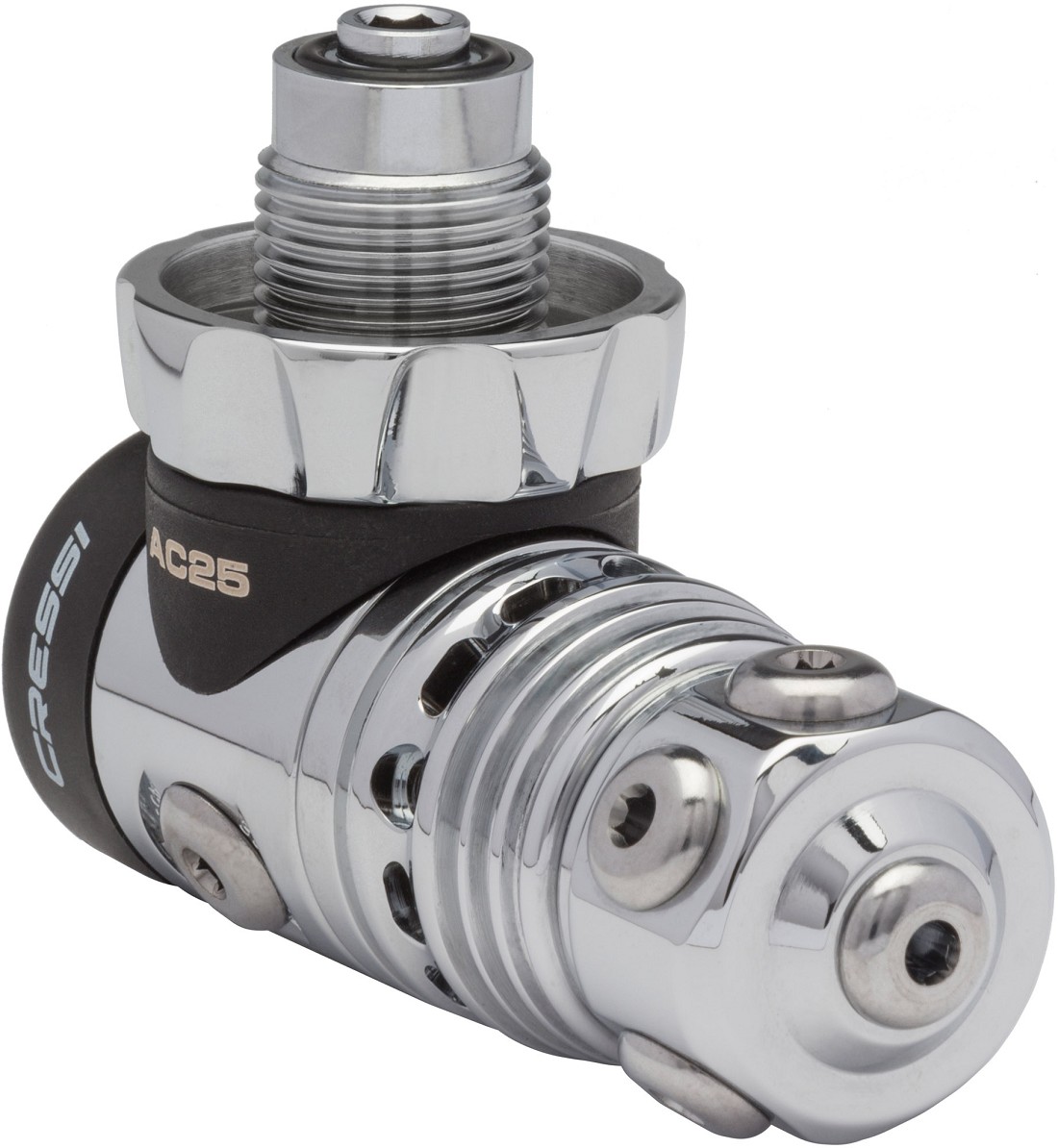 Il modello AC25 appartiene alla terza generazione del primo stadio a pistone bilanciato con pressione intermedia regolabile di Cressi.
