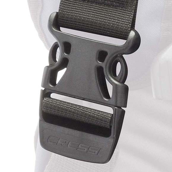 La fibbia da 50 mm dello spallaccio è basculante secondo un nuovo brevetto Cressi, per garantire una perfetta adattabilità a tutti i tipi di fisico. Il sistema modulare del fascione addominale, con design esclusivo Cressi, offre la possibilità di cambiare velocemente il fascione stesso – diviso in due parti – per adattarsi alle diverse taglie.
