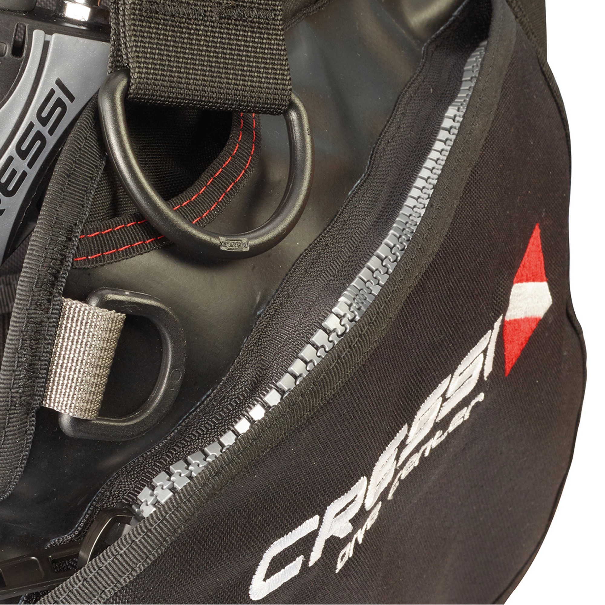 Cordura 500 denari. Il Cordura garantisce una maggiore resistenza all’erosione dovuta ad attrito a lungo termine e prolunga la durata della saldatura termica in quanto è più dura del Nylon. Questa caratteristica è particolarmente importante nei centri di immersione dove il gonfiaggio del bcd è ripetitivo e frequente fino al limite della sua capacità.