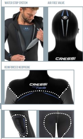 Muta umida monopezzo con diversi spessori (8, 6 e 5 mm) e cappuccio per acqua fredda.