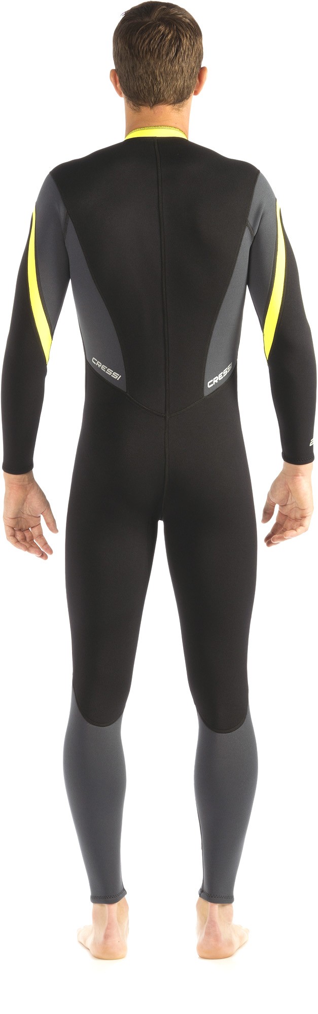 Monopezzo in neoprene di 2,5 mm per acque calde con pannelli assemblati mediante cucitura piana.