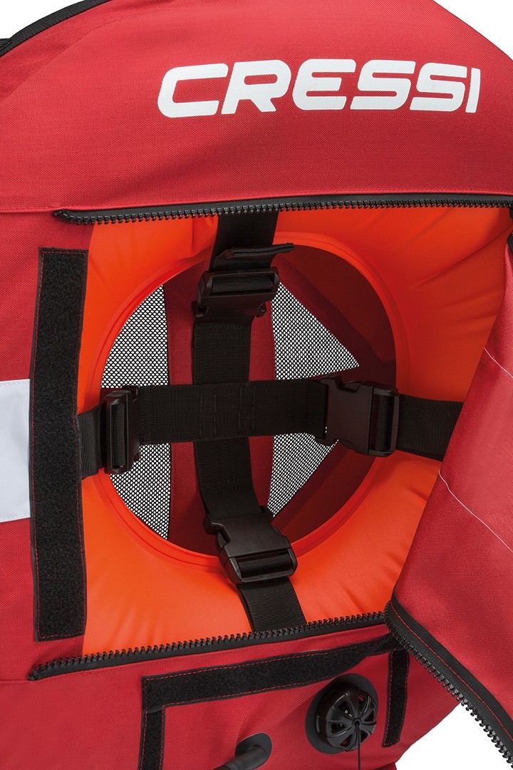 Il dispositivo di gonfiaggio è a bocca, con valvola di sovrapressione. A un D-ring in acciaio inossidabile può essere collegata la sagola da apnea. La bandiera è inclusa.