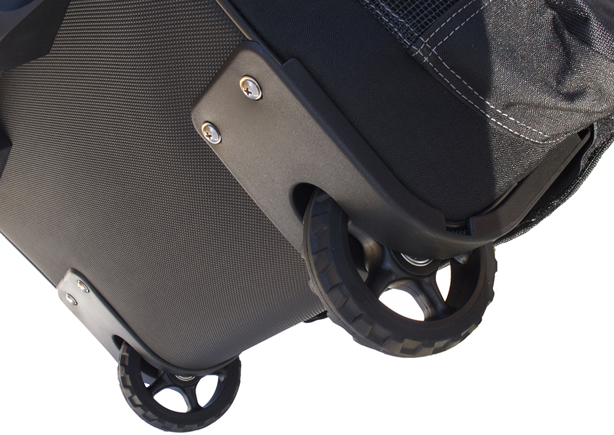 Due ruote di grande diametro rotolano agevolmente su terreni irregolari e possono essere rimosse e sostituite in caso di danni. Lo scomparto principale si apre su tre lati, consentendo un rapido accesso a tutto ci? che contiene senza dover disfare l'intera borsa.