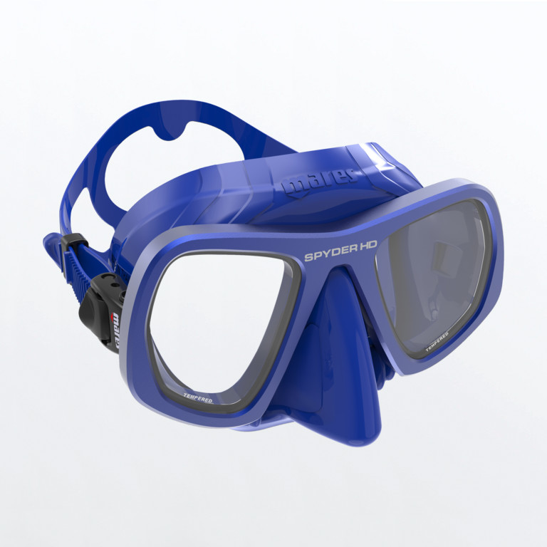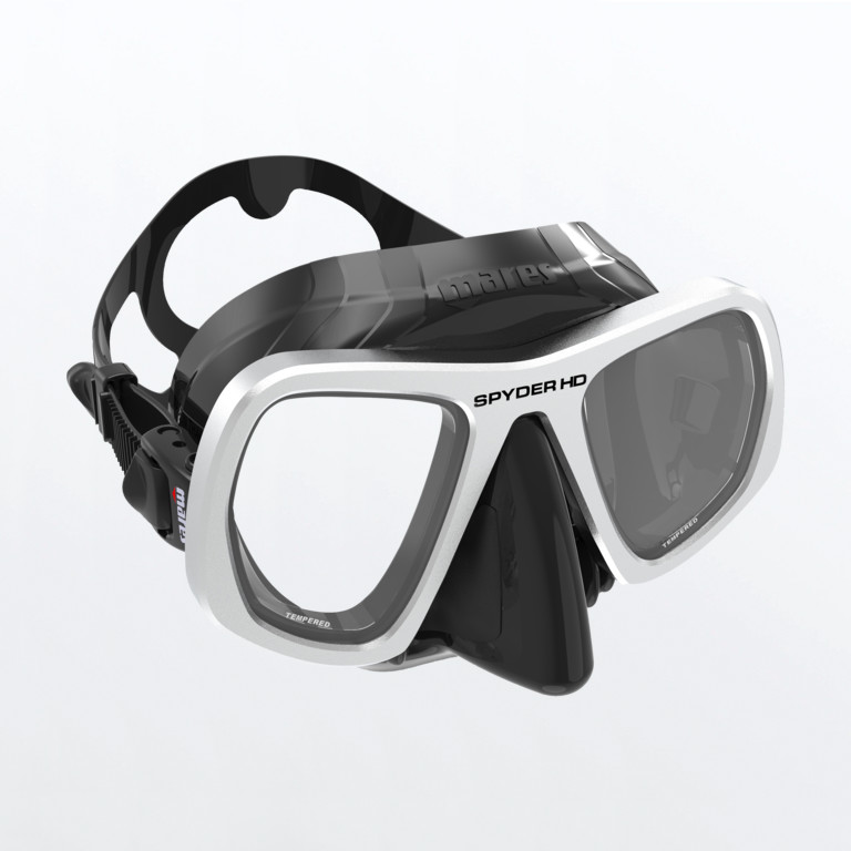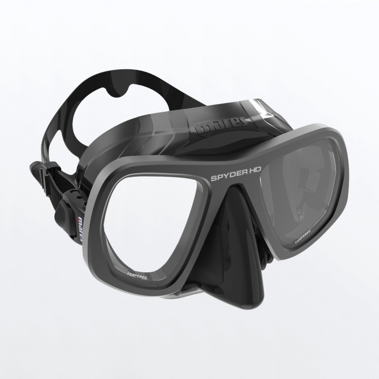 La maschera per pesca in apnea Spyder HD ha doppia lente e volume ridotto .