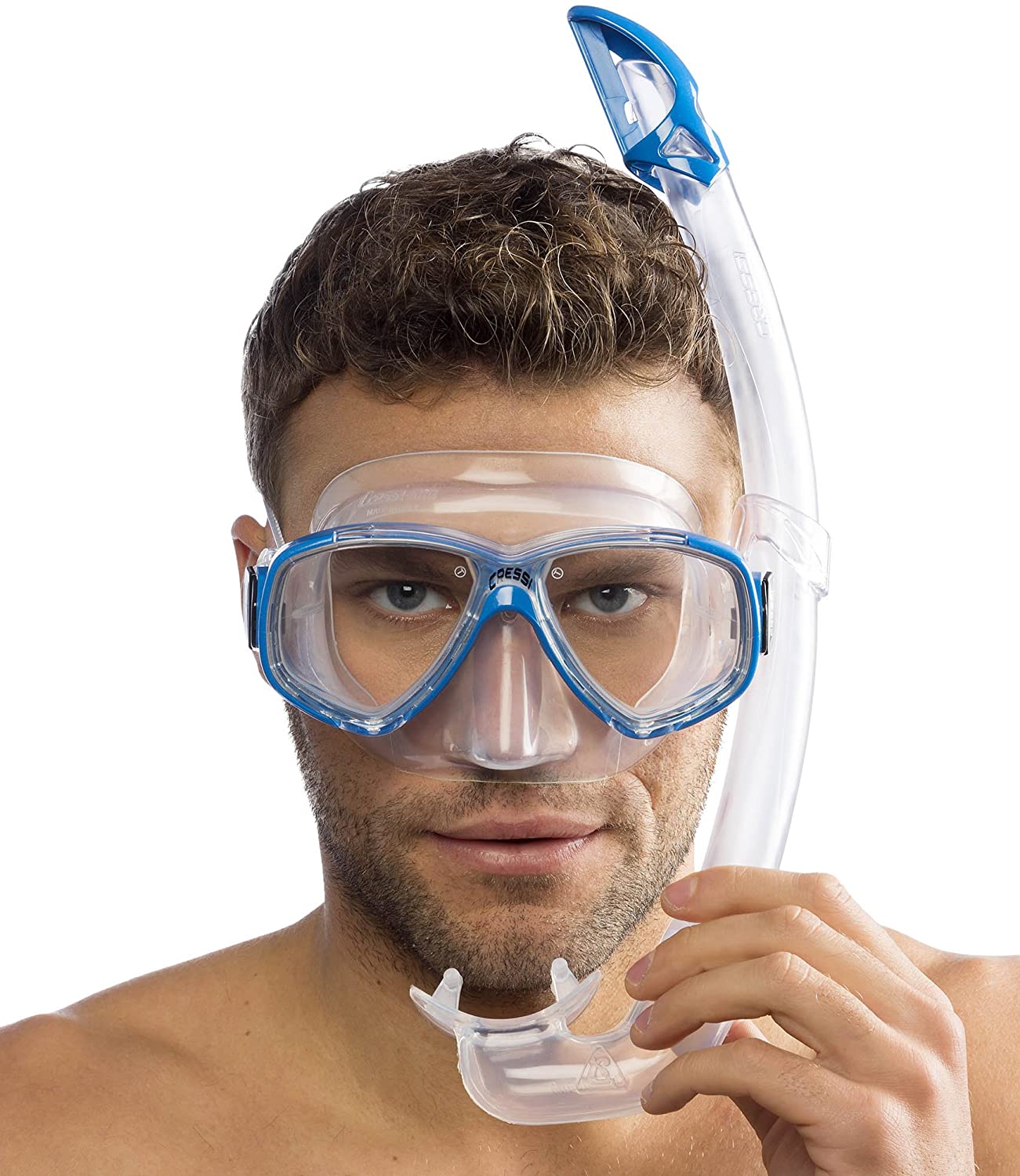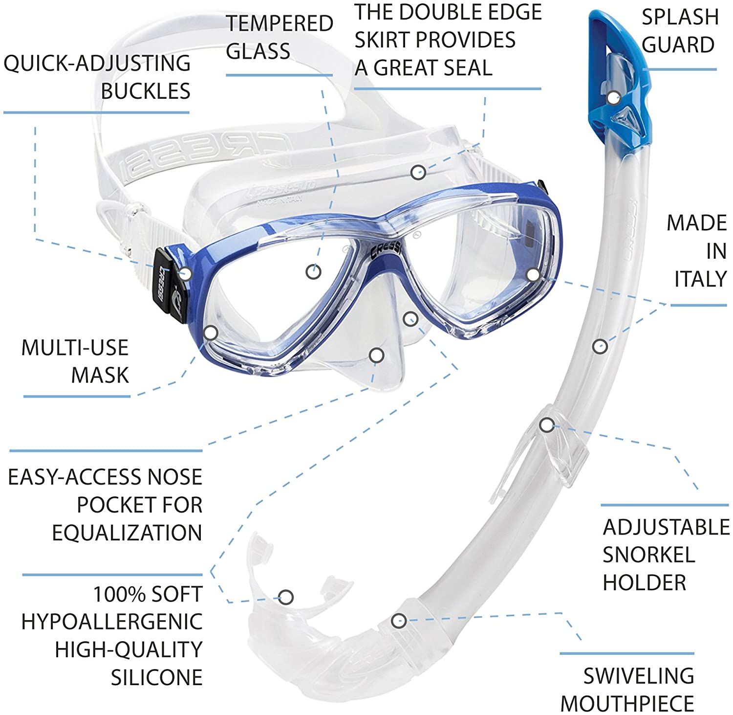 E' dotata di vetri separati, facciale morbido, flangia interna che si adatta alla maggior parte delle conformazioni del viso e offre un elevato comfort. Il volume interno è notevolmente ridotto, ottimo per l'apnea. Realizzato in morbido silicone anallergico, è dotato di robuste fibbie per la regolazione del lacciolo. Modello Cressi con frusta flessibile e sagomata che si adatta in modo ottimale alle diverse forme del viso. Il modello Mexico ha una frusta sagomata che riduce drasticamente l'ingresso dell'acqua dall'alto, senza ostacolare la respirazione. Boccaglio anatomico in silicone trasparente e anallergico.