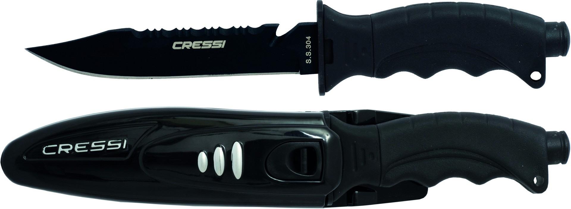 Un coltello moderno con design di ultima generazione e dimensioni medie, dotato di una lama resistente forgiata in acciaio speciale con trattamento in black coating. L’impugnatura presenta una forma anatomica ed è realizzata in materiale “soft grip” per una presa sicura. È separata dalla lama mediante un’elsa integrata in tecnopolimero. Dispone di un manico dello stesso materiale della lama. La lama è fabbricata con uno speciale acciaio temprato inossidabile e presenta un lato liscio e uno dentellato. Quest’ultimo termina, vicino all’impugnatura, con un incavo per tagliare reti e fili da pesca. La custodia è realizzata in tecnopolimero di colore nero ed è dotata di passanti per il fissaggio alla coscia o alla cintura. Il sistema di aggancio del coltello alla custodia funziona con un pulsante a molla integrato alla struttura della stessa ad azionamento rapido. Completano il coltello due cinghioli in dotazione che consentono di fissarlo alla coscia.