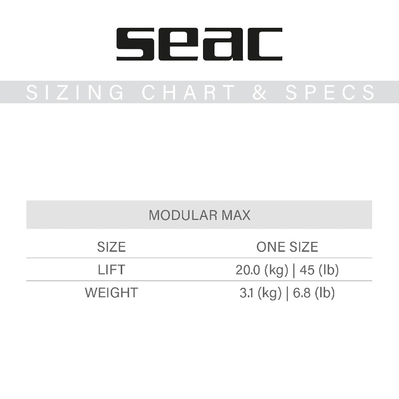 La dotazione standard di Seac Modular Max include: imbragatura con spallacci removibili e schienalino morbido con anima in acciaio, anch'essa removibile, sacco anulare, 2 tasche con sgancio rapido della zavorra, 4 anelli a D in alluminio anodizzato e fibbia ventrale in acciaio inossidabile.